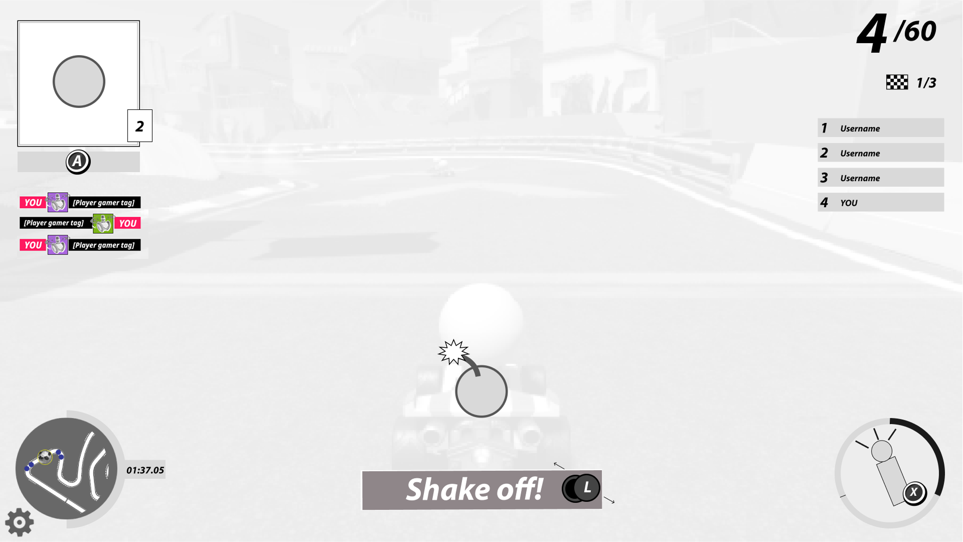 Rework on controller input buttons to use when you are attacked by a powerup. A rule was created to keep it to a one button input maximum. As with the wireframe above, the “shake off” controller prompt was changed to the left joystick so that player could mimic the “swerve” motion when the sticky bomb was stuck on their character. This prompt was animated to indicate that movement in any direction can have the intended impact. This added immersion whilst also allowing them to continue driving with the right joystick.