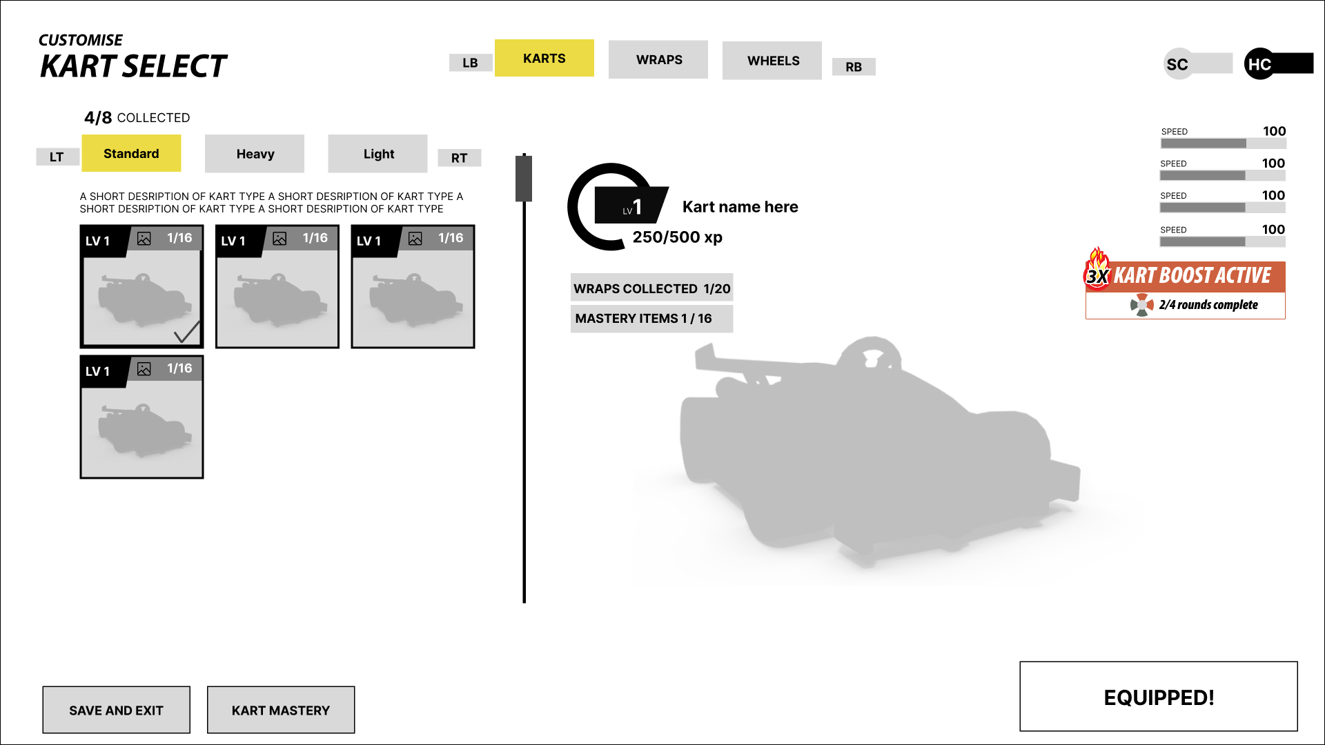 To make the moment to moment racing more enticing, I designed the UX of the boost system. This worked so that by drifting, the player could accumulate 3 boosts. It was important to make it clear when the boost bar was filling vs usuable, designing the visual for this was super fun!
