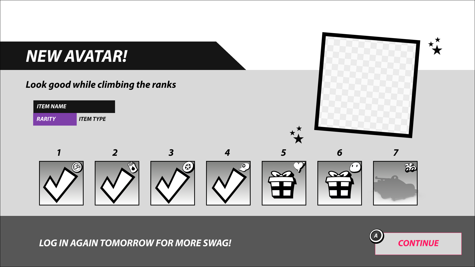 On the home page, kart customisation and end of round screens we added prompts for how many rounds the current kart bonus would remain as well as how a bonus being active impacts reward output at the end of a match. This would keep the bonus perks salient in player minds, with clear indication of how long the current bonus would last.