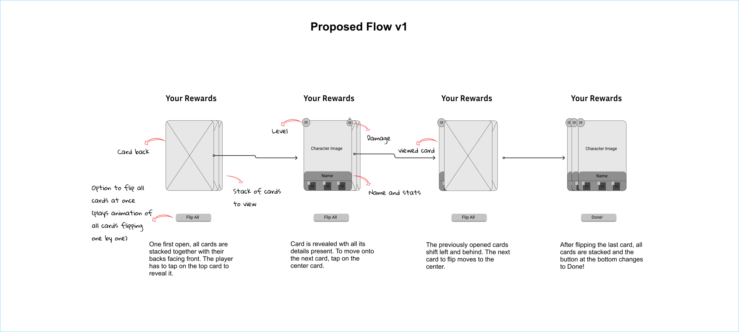 It’s hard to tell where to pay attention in screen 3, where the viewed card shifts to the left. Does the player look at the center or the shiny card on the left? This distracts from the aim that the player should focus on one card at a time.