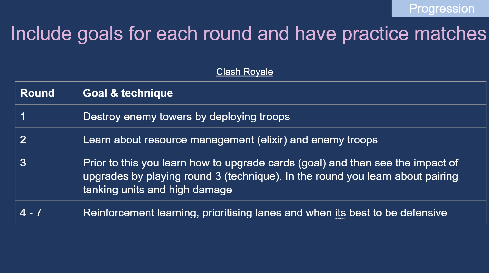 I wasn’t able to go in as deep as I would have liked to with reworking the FTUE however I found that there were issues around pacing of teaching (lots of frontloading) and creating a clear sense of progression (it wasn’t clear what the overall goals were per round). I researched the FTUE of competitor titles and found that for each round of play during the tutorial, players are always given a new goal and technique to learn that builds upon the previous round. This provides a reference model of how to break down the teaching process and prioritising what’s important to teach when.
